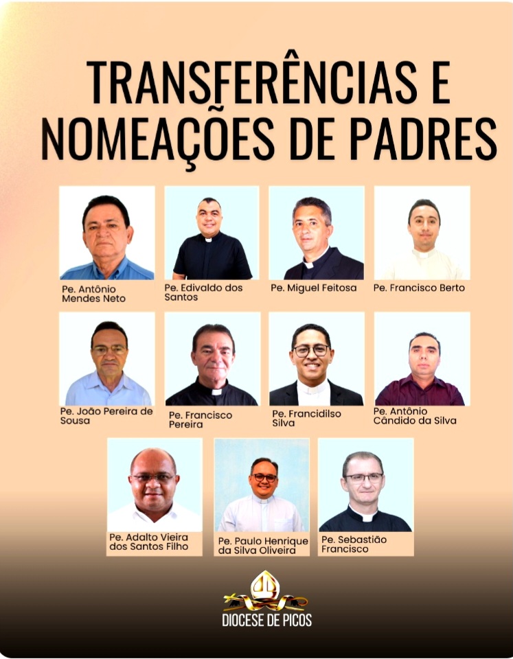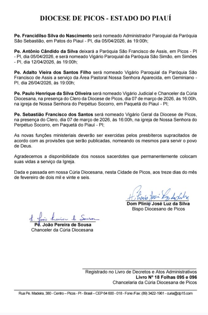 Nesta sexta-feira, 13 de fevereiro de 2026, o Bispo Diocesano de Picos, Dom Plínio José Luz da Silva, divulgou uma Nota Oficial com a relação de onze padres que assumirão novas funções nas paróquias e áreas pastorais da Diocese de Picos.