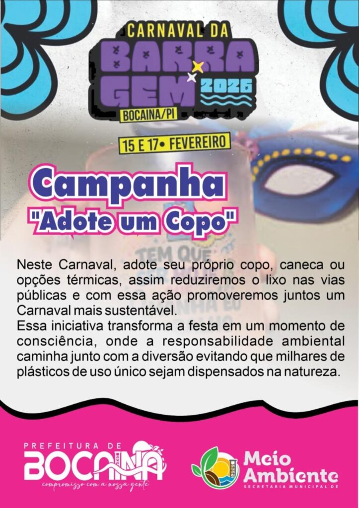 A Secretaria Municipal de Meio Ambiente de Bocaina, através do secretário João Celestino e a Prefeitura Municipal, prefeito Guilherme Macedo e vice Naldo Leão, estão promovendo a campanha “Adote um Copo” durante o período carnavalesco.